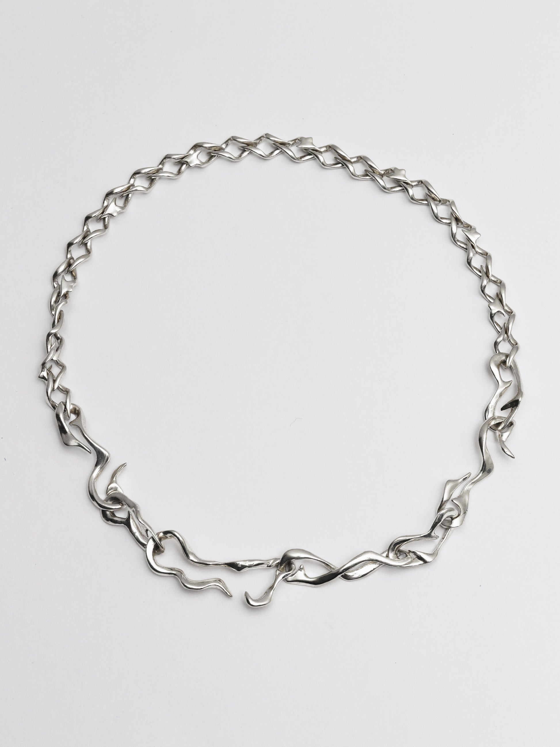 The BB Miro Necklace is a polished 925 sterling silver chain crafted as an endless loop from six unique links, featuring a distinctive hook and clasp fastening. Designed with two distinct styles in one chain, it offers versatile options for how to wear it. Each piece is handcrafted, celebrating subtle details and unique variations that make every necklace one-of-a-kind.