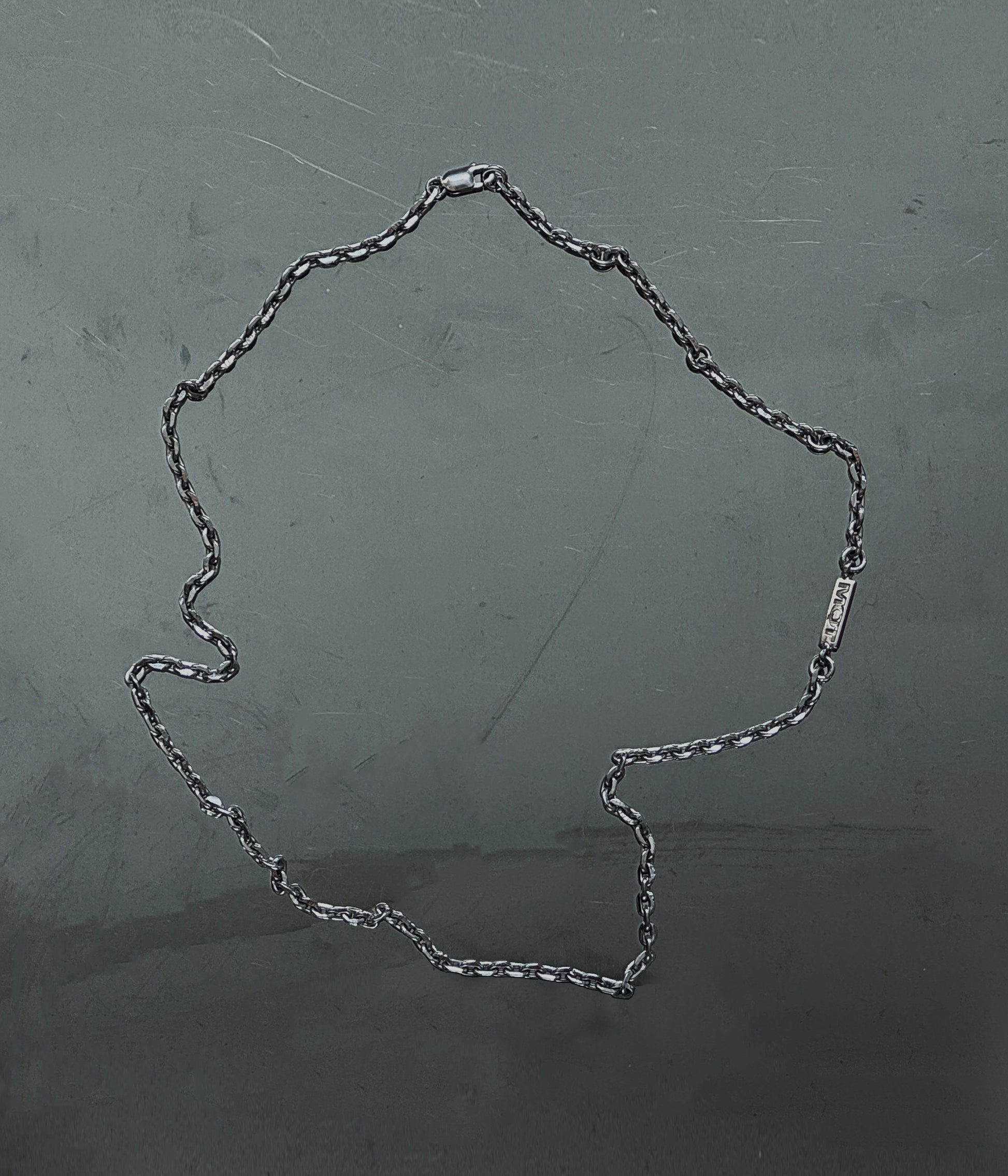 Embossed MQT plate embedded into diamond cut trace chain. Adjustable length.